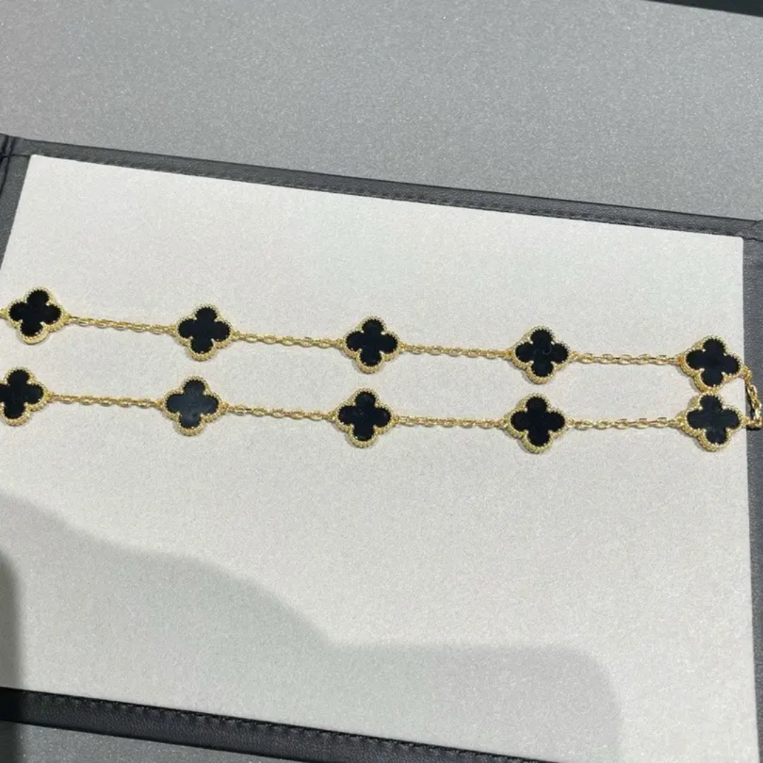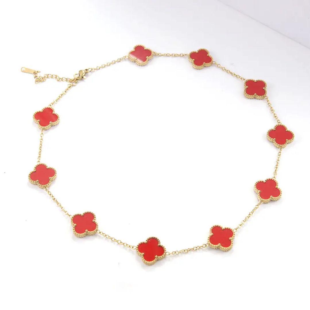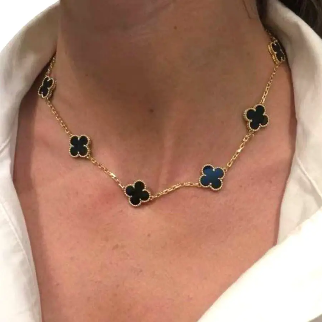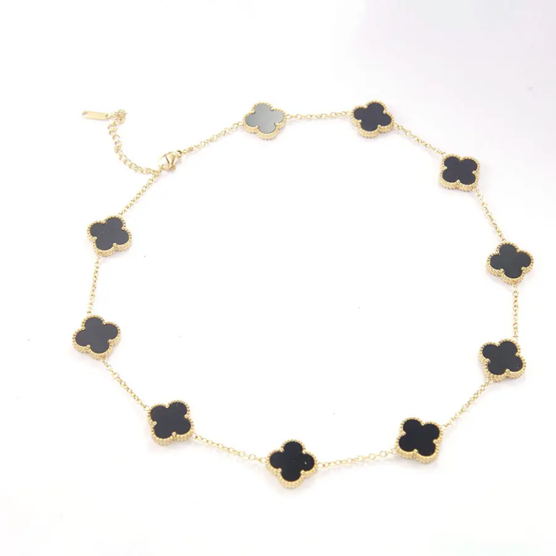 هذه القلادة الجميلة مصممة بعناية، وتتميز بعشر قلادات على شكل برسيم، بحواف ذهبية رقيقة. خيار مثالي لأي مناسبة لإكمال إطلالتك.