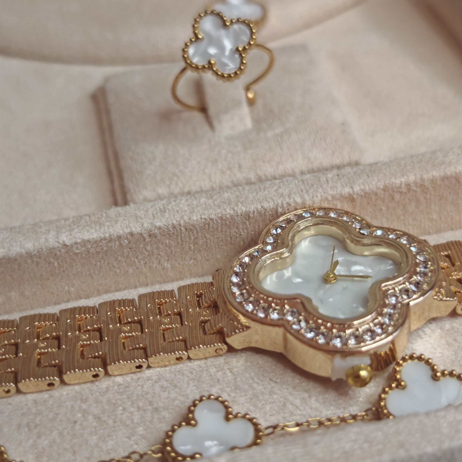 طقم مجوهرات نسائي، مجوهرات ذهبية فاخرة، مجوهرات على شكل زهرة البرسيم، مجوهرات INTERO هولندا، إكسسوارات نسائية 2025، هدية لها، طقم مجوهرات حصري، مجوهرات ذهبية وسوداء، مجوهرات من الذهب الأبيض، ساعة نسائية أنيقة، مجوهرات عصرية، مجوهرات أنيقة للنساء، متجر مجوهرات إلكتروني في هولندا