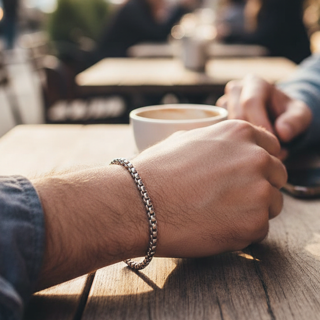 De fijne 2mm box chain heeft een strakke, minimalistische uitstraling die perfect past bij de moderne man. De lange 60cm ketting valt mooi op de borst en creëert een relaxte, eigentijdse look. Ideaal voor layering met andere kettingen of solo gedragen voor een subtiele statement.
