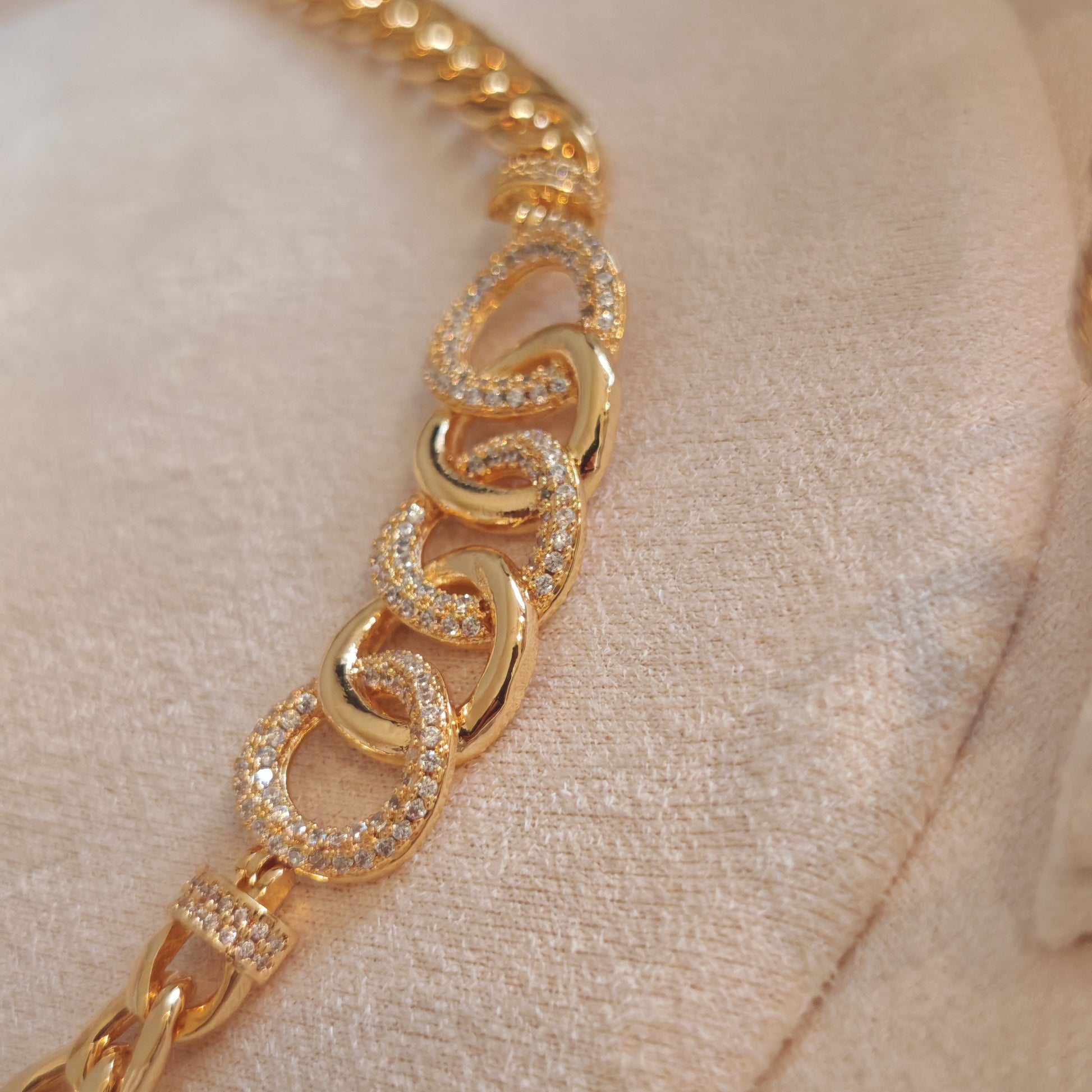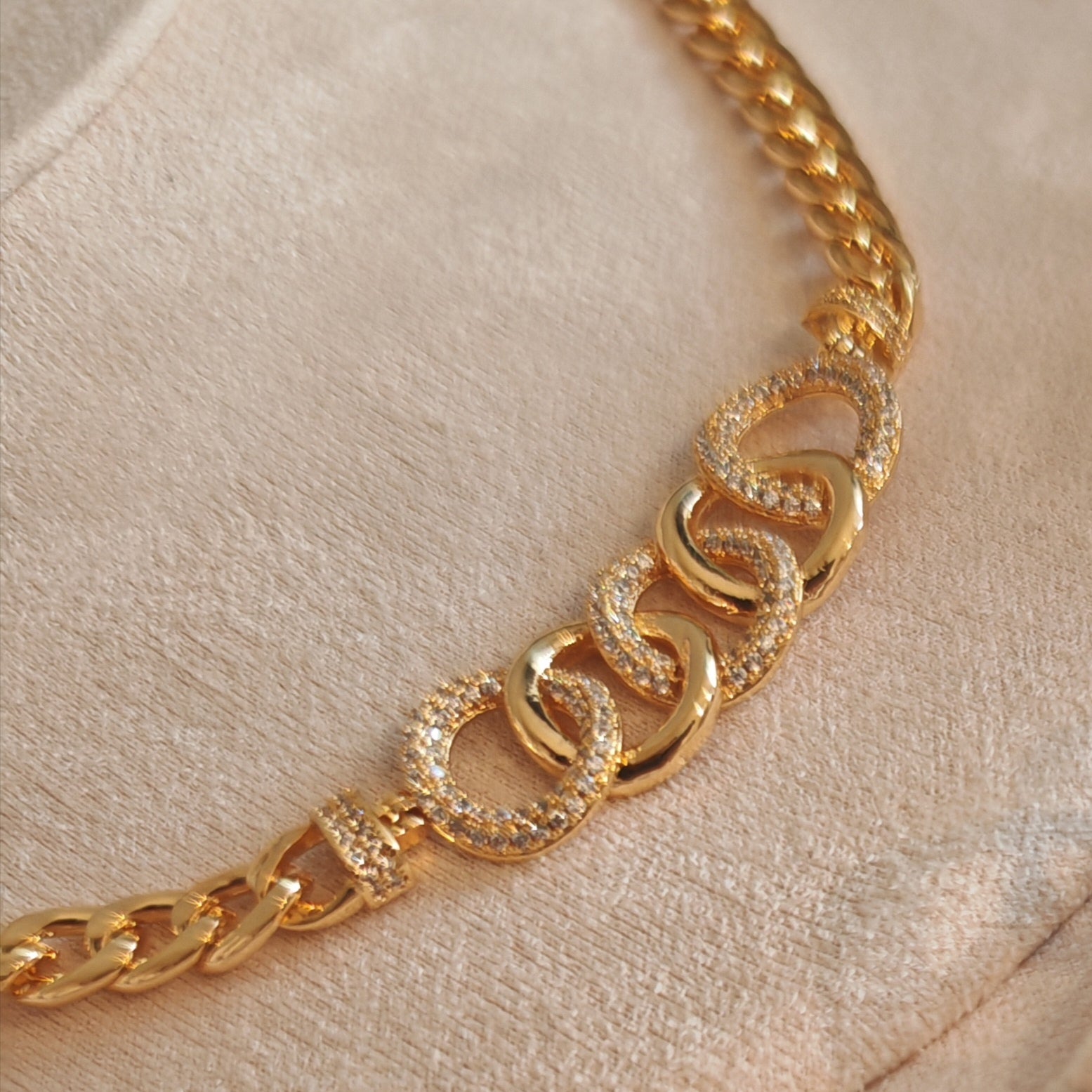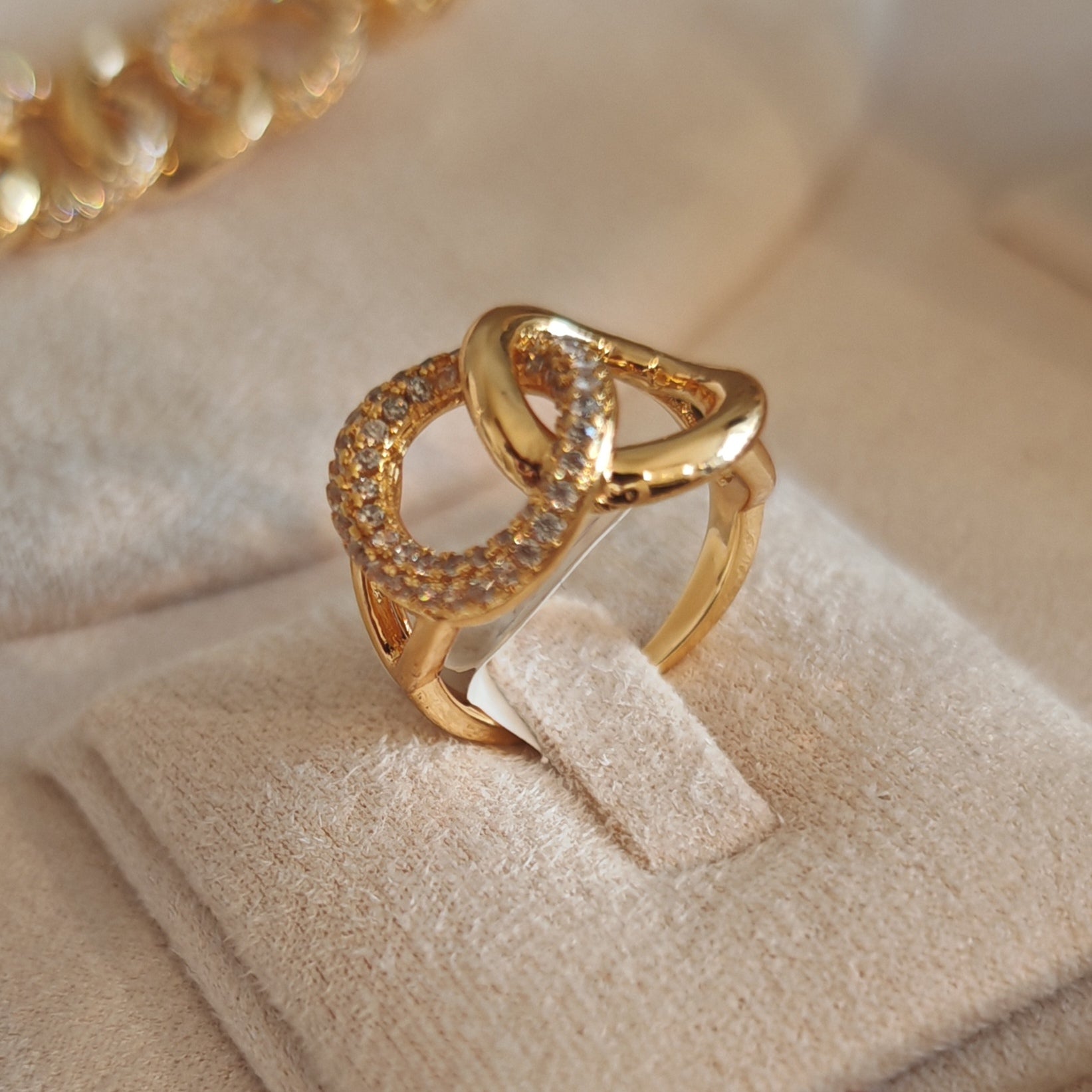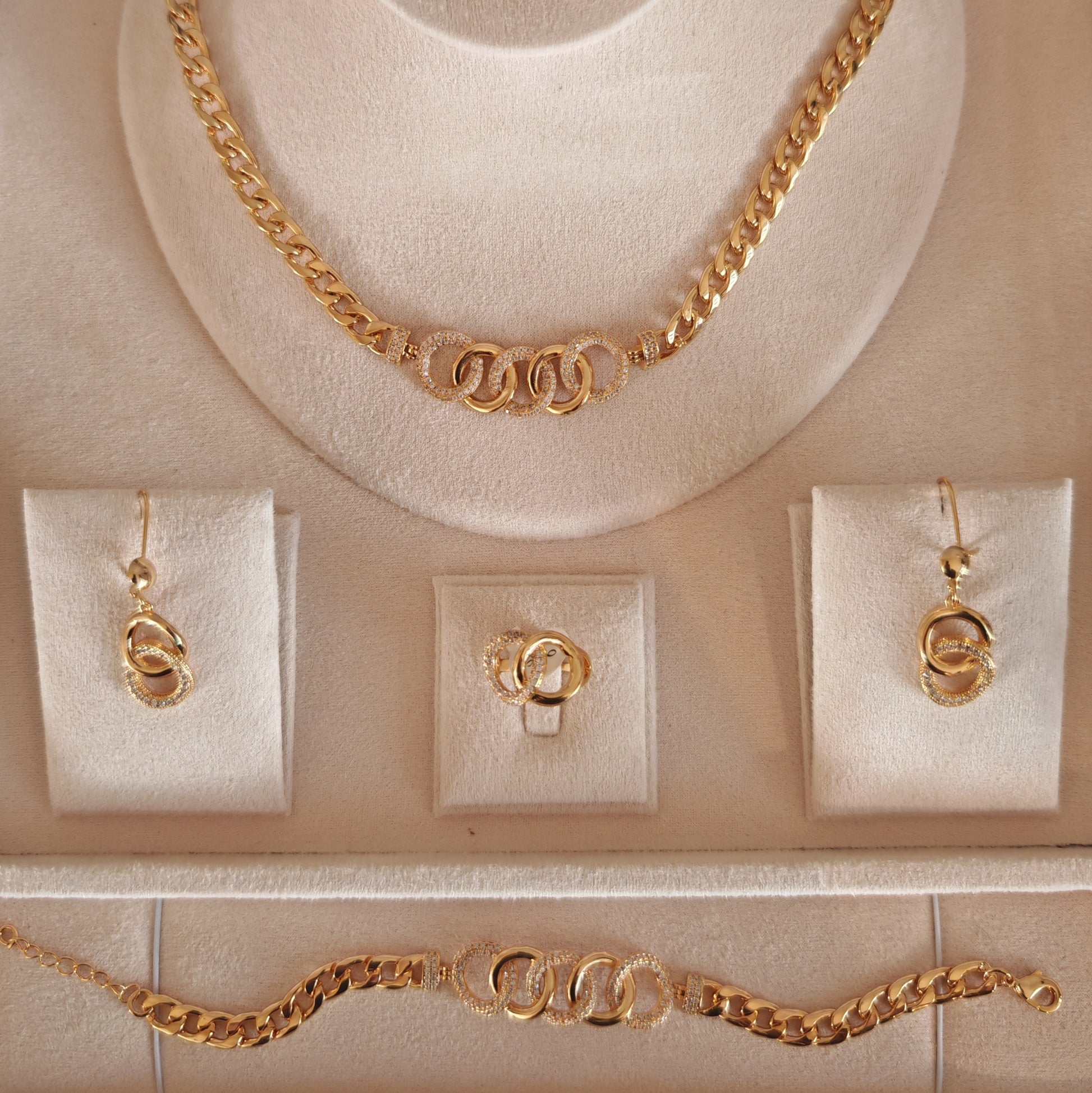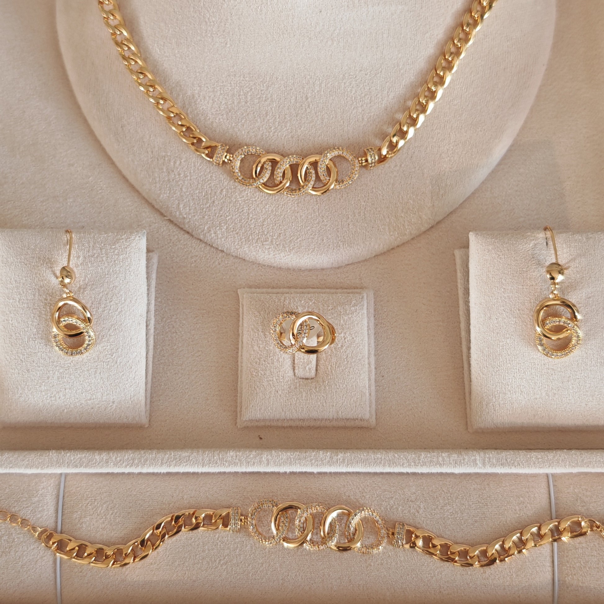 De ketting straalt klasse uit met haar klassieke schakelketting en drie in elkaar gevlochten ringen als middelpunt. De bijpassende armband en ring volgen hetzelfde elegante ontwerp, terwijl de oorbellen het geheel perfect aanvullen met hun vrouwelijke en verfijnde vorm.