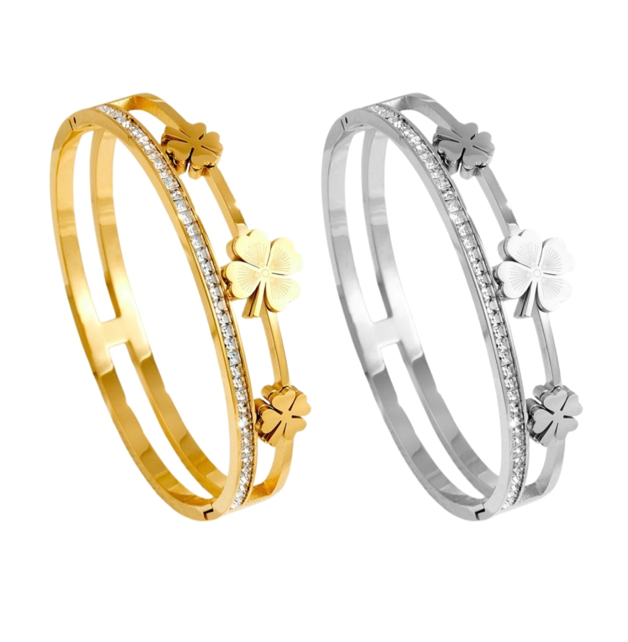 Luxe geluksarmband met klavertje vier symbool - Een betoverende armband die geluk en stijl combineert. Deze prachtige armband is versierd met drie iconische klavertjes vier (four-leaf clover) en een elegante kristallijn bezette baan.