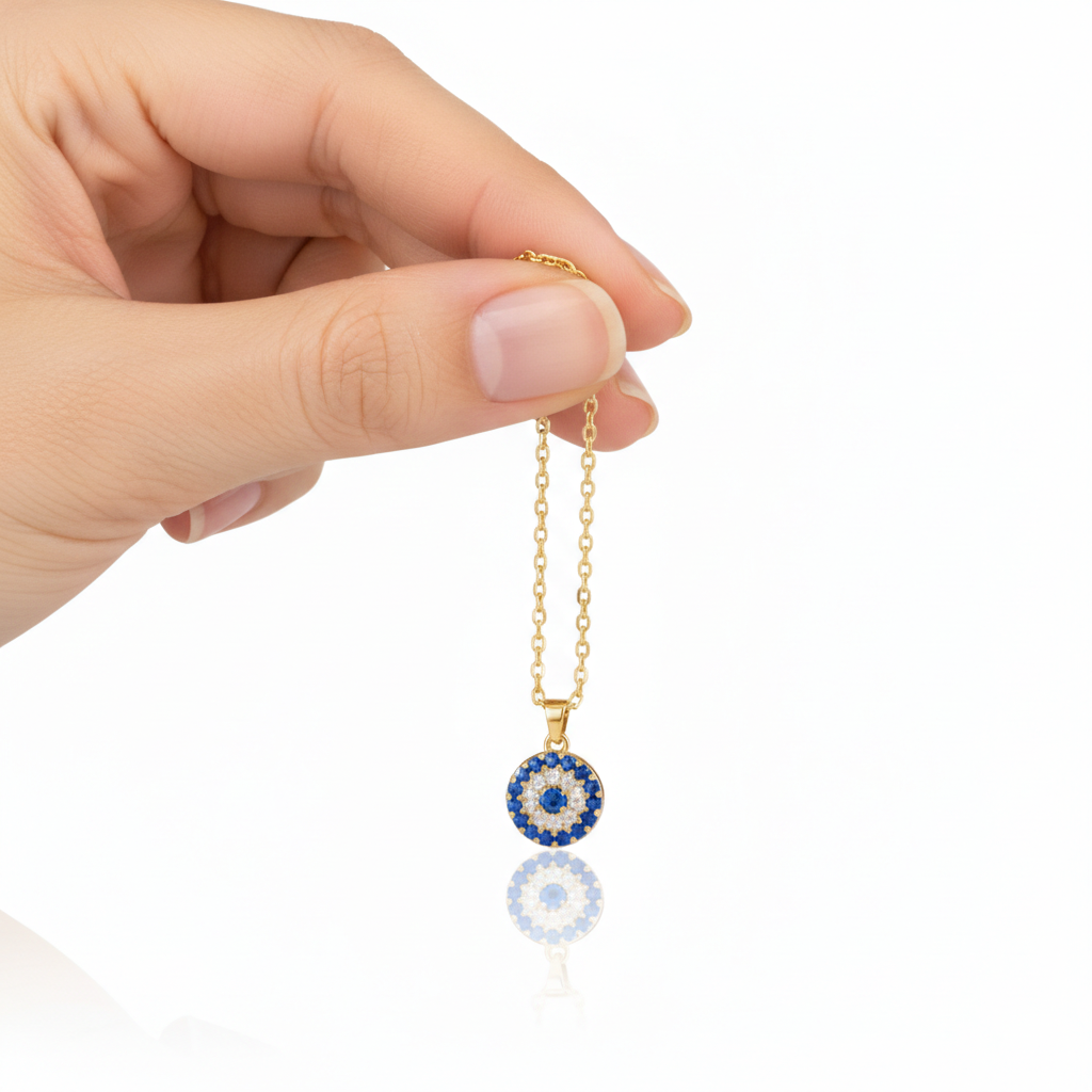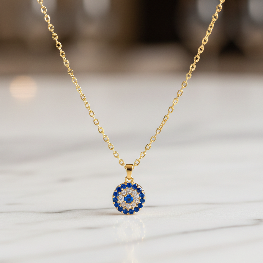 Deze prachtige ketting met een betoverend Evil Eye ontwerp is een echte eyecatcher. De elegante hanger met blauwe en witte steentjes in een concentrisch patroon symboliseert bescherming en stijl.