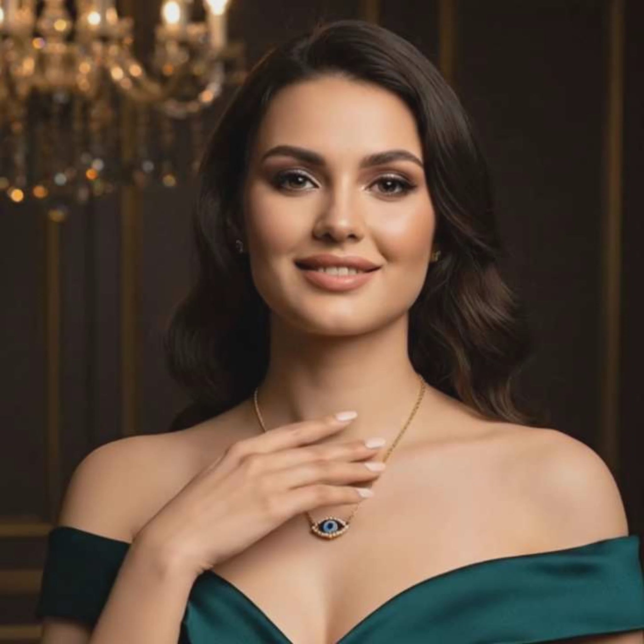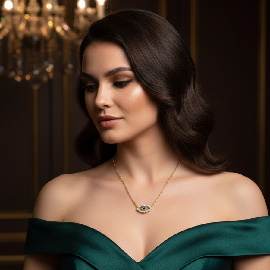 Deze prachtige ketting met een elegant Evil Eye ontwerp in oogvorm is een echte blikvanger. De verfijnde hanger met blauwe en witte steentjes in een oogvormig patroon symboliseert bescherming en stijl.