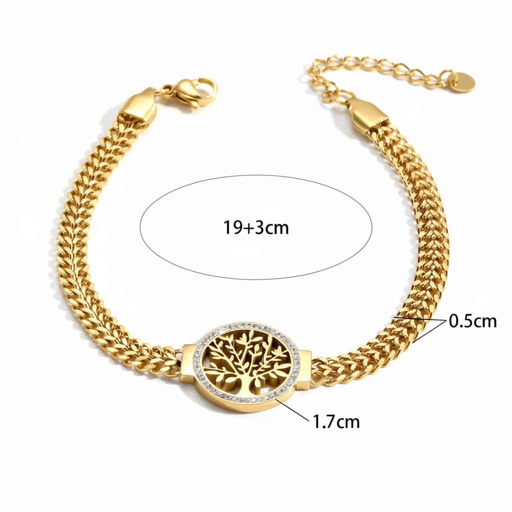 Ontdek deze prachtige levensboom armband die symboliek en stijl perfect combineert! Met zijn gedetailleerde boom des levens hanger en luxe gevlochten schakelketting is deze armband een betekenisvol sieraad voor elke dag.