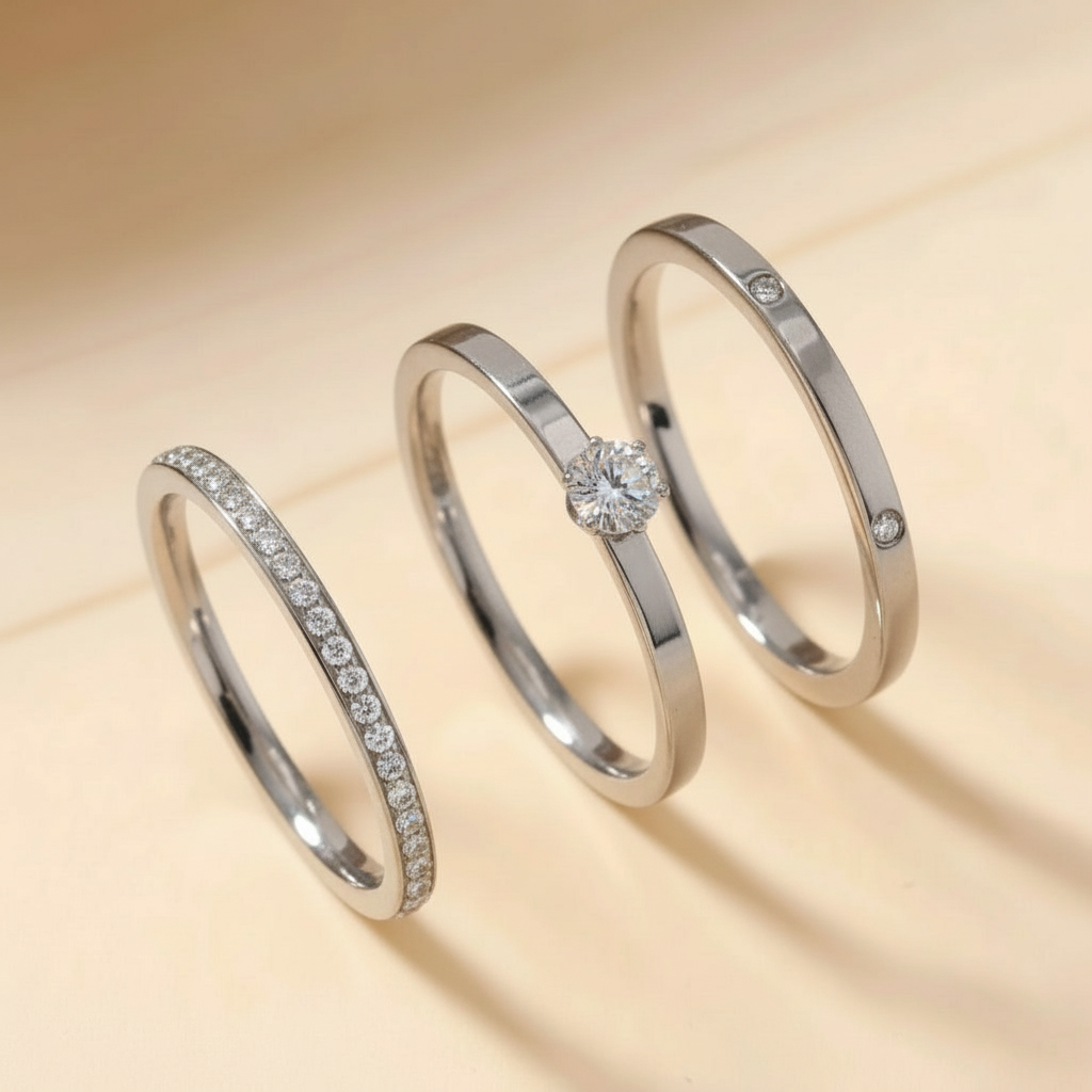 Deze elegante ringenset is beschikbaar in zowel een gouden als zilveren uitvoering, beide met een gepolijste en glanzende afwerking.